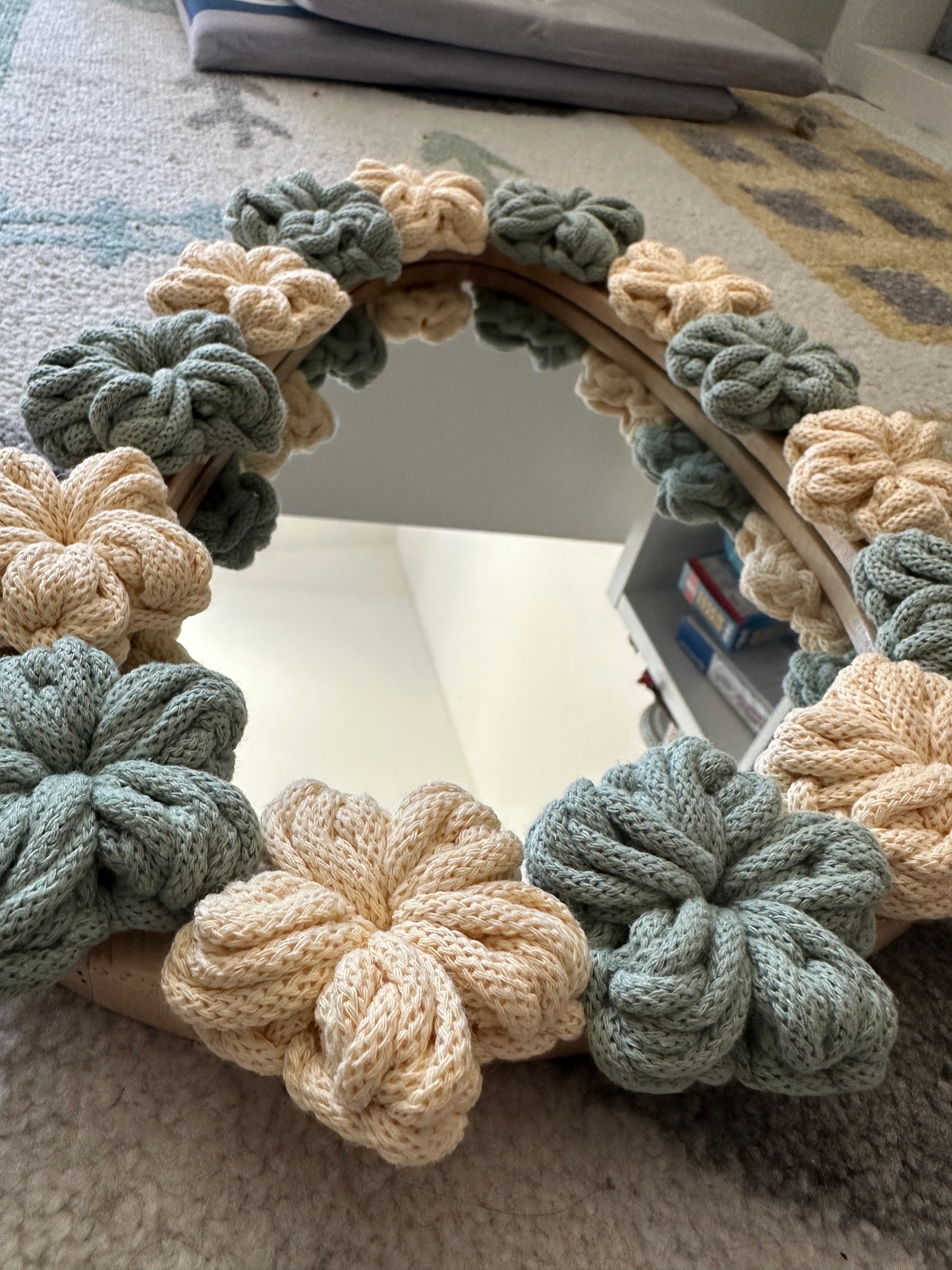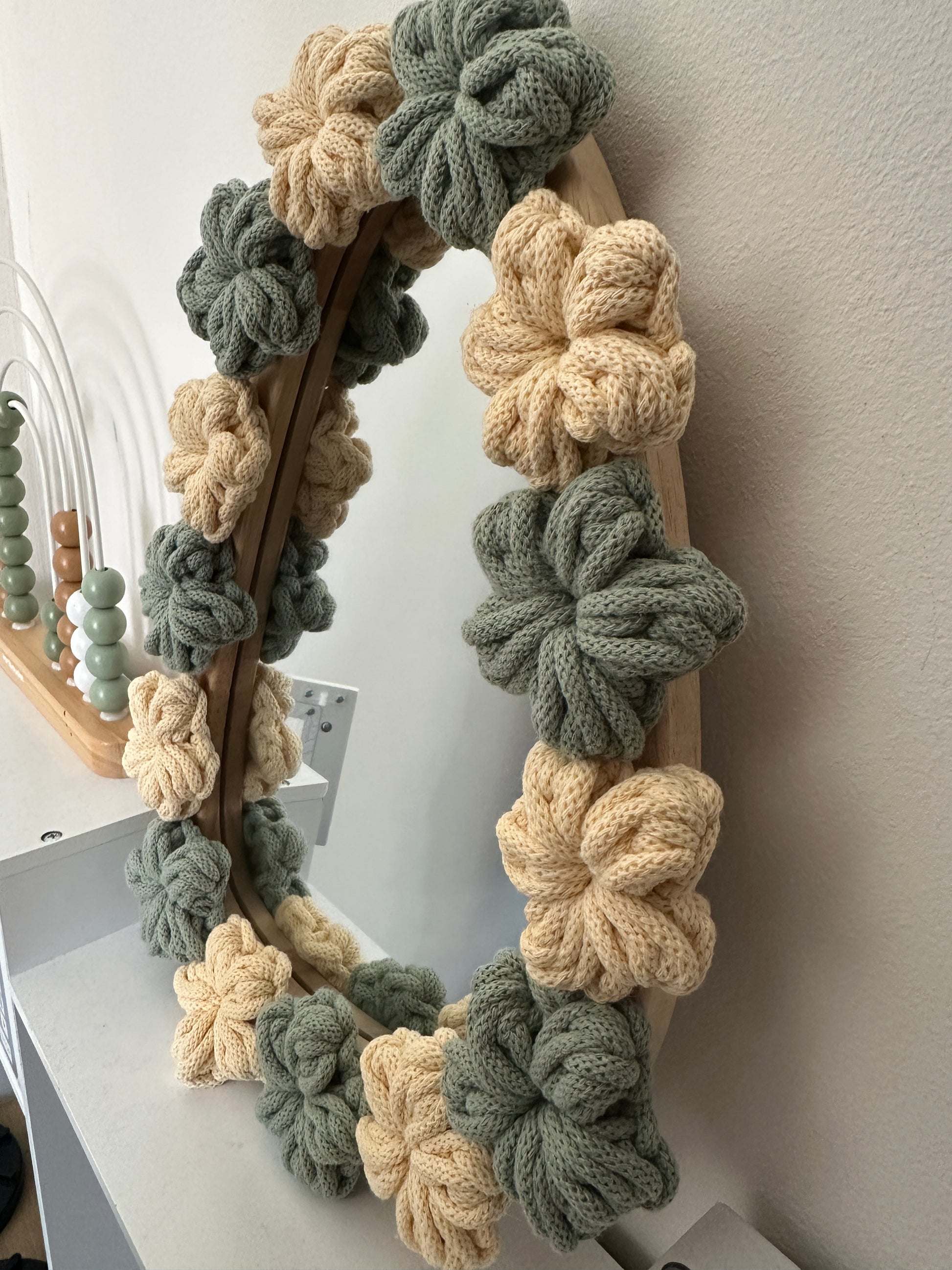 Spiegel mit gehäkelten Blumen – Handgemachtes Highlight in Butter Yellow & Aloe, es ist ein Einzelstück!