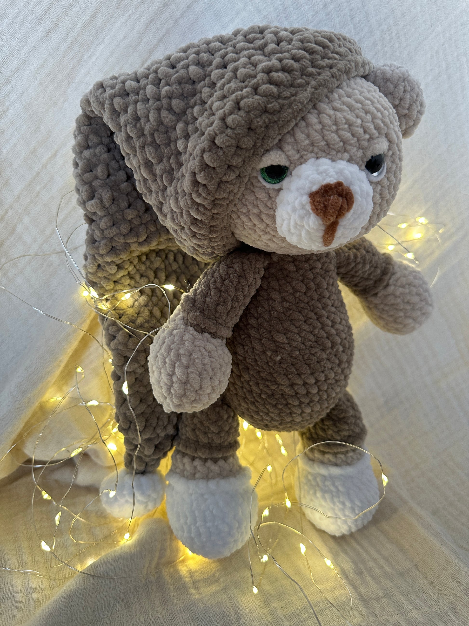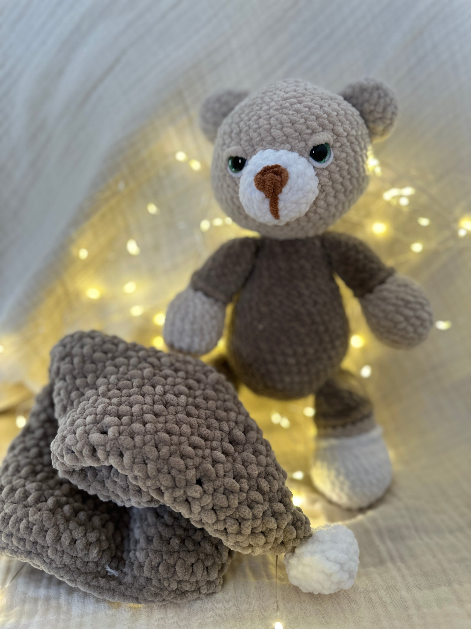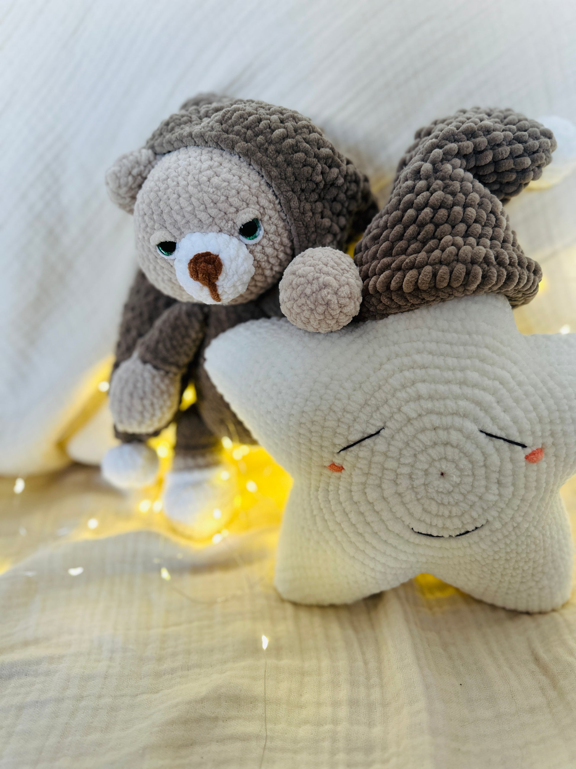 Lernen Sie Bruno kennen – einen kleinen, handgehäkelten Bären mit einer weichen Schlafmütze, der nur eines möchte: kuscheln, trösten und beim Einschlafen helfen.